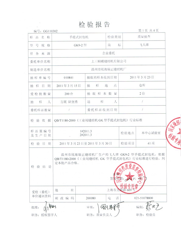 本厂GK9系列封包机通过国家缝纫机质量监督检验中心检测,检测标准:QB/T1180-2000《工业用缝纫机GK型手提式封包机》